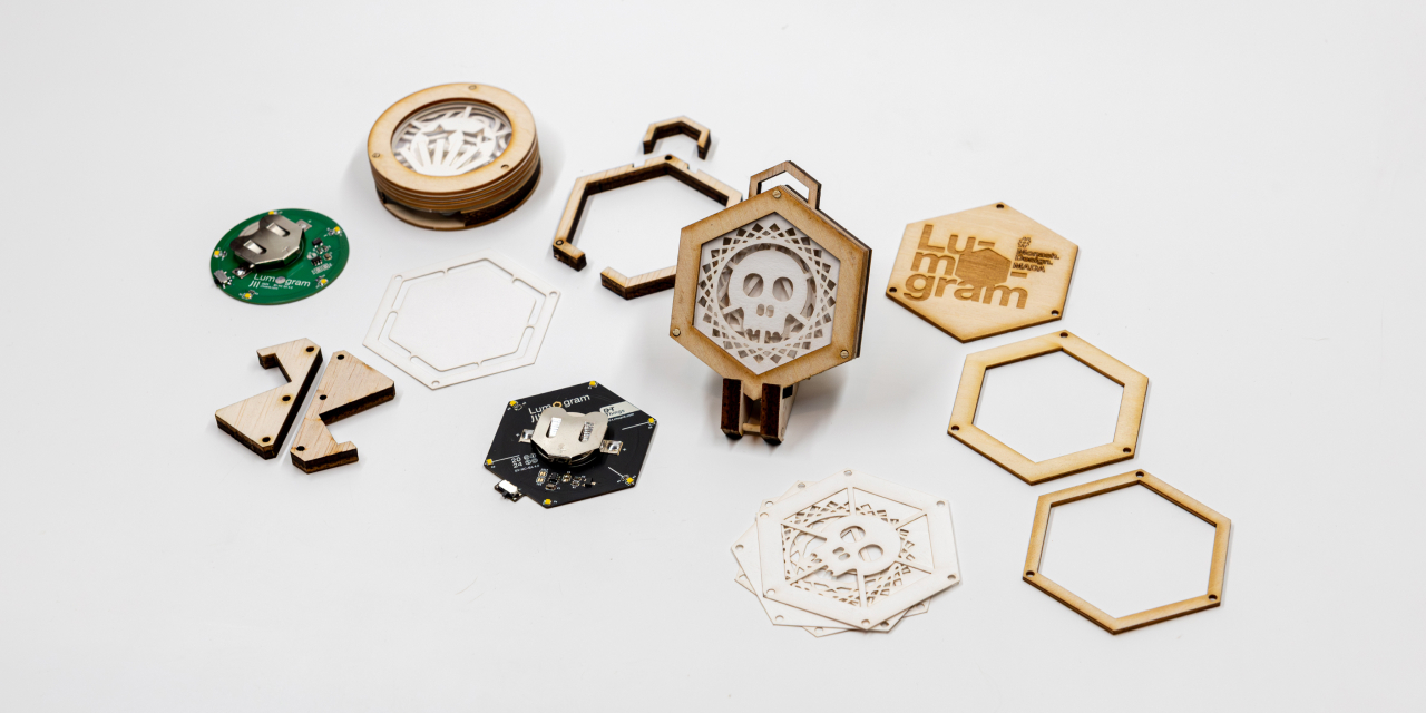 Lumogram is an interactive, backlit diorama pendant, made with environmentally-mindful materials (wood and paper) and bespoke, re-usable touch-activated electronic lighting.
